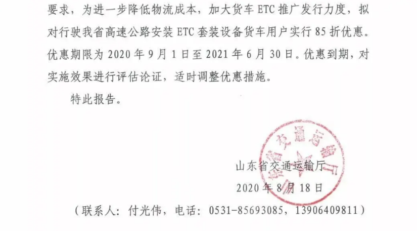 山東省表示:為進(jìn)一步降低物流成本,加大貨車ETC推廣發(fā)行力度,擬對(duì)行駛在山東省高速安裝ETC套裝設(shè)備貨車用戶實(shí)行85折優(yōu)惠,期限為2020年9月1日至2021年6月30日。