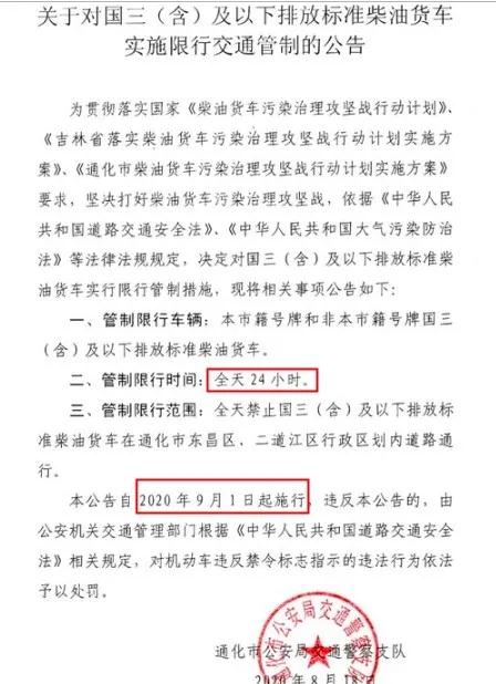 管制限行范圍:全天禁止國(guó)三(含)及以下排放標(biāo)準(zhǔn)柴油貨車在通化市東昌區(qū)、二道江區(qū)行政區(qū)劃內(nèi)道路通行。