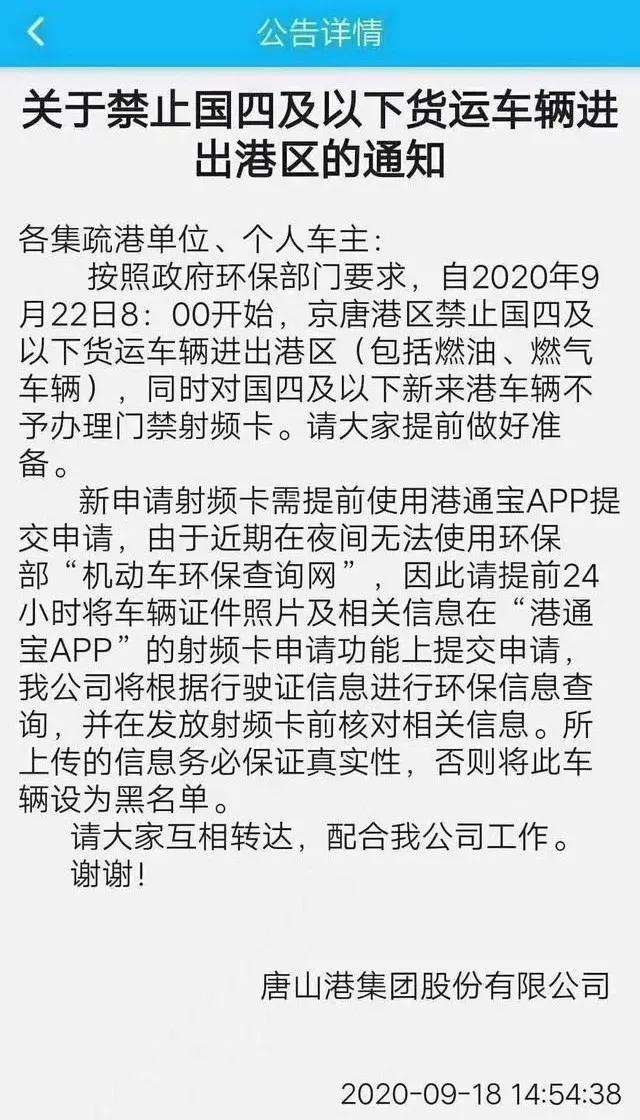 河北唐山港發布通知,9月22日上午八點開始,京唐港區將禁止國四及以下貨運車輛進出港區,包括燃油、燃氣車輛,同時不再給國四及以下新來港車輛辦理門禁射頻卡。
