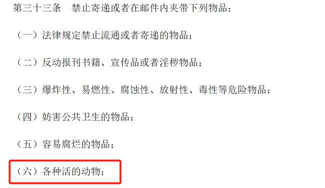 但是,根據《郵政法》相關規定,是明令禁止郵寄運輸活體動物。(除特殊運輸外,如具備相關證明的航運是允許運輸的。)